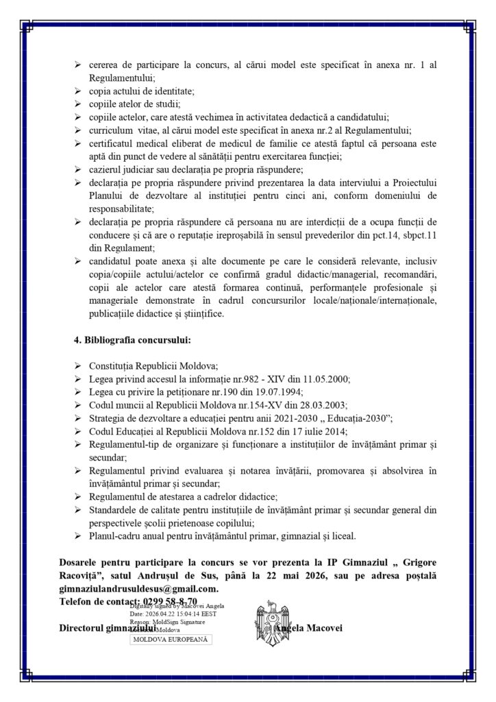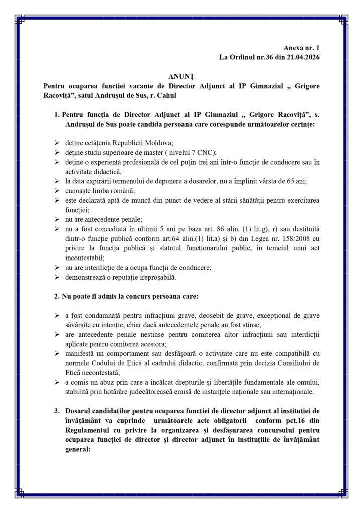 IP Gimnaziul ”Grigore Racoviță”,s.Andrușul de Sus anunţă concurs pentru ocuparea funcţiei vacante de director adjunct